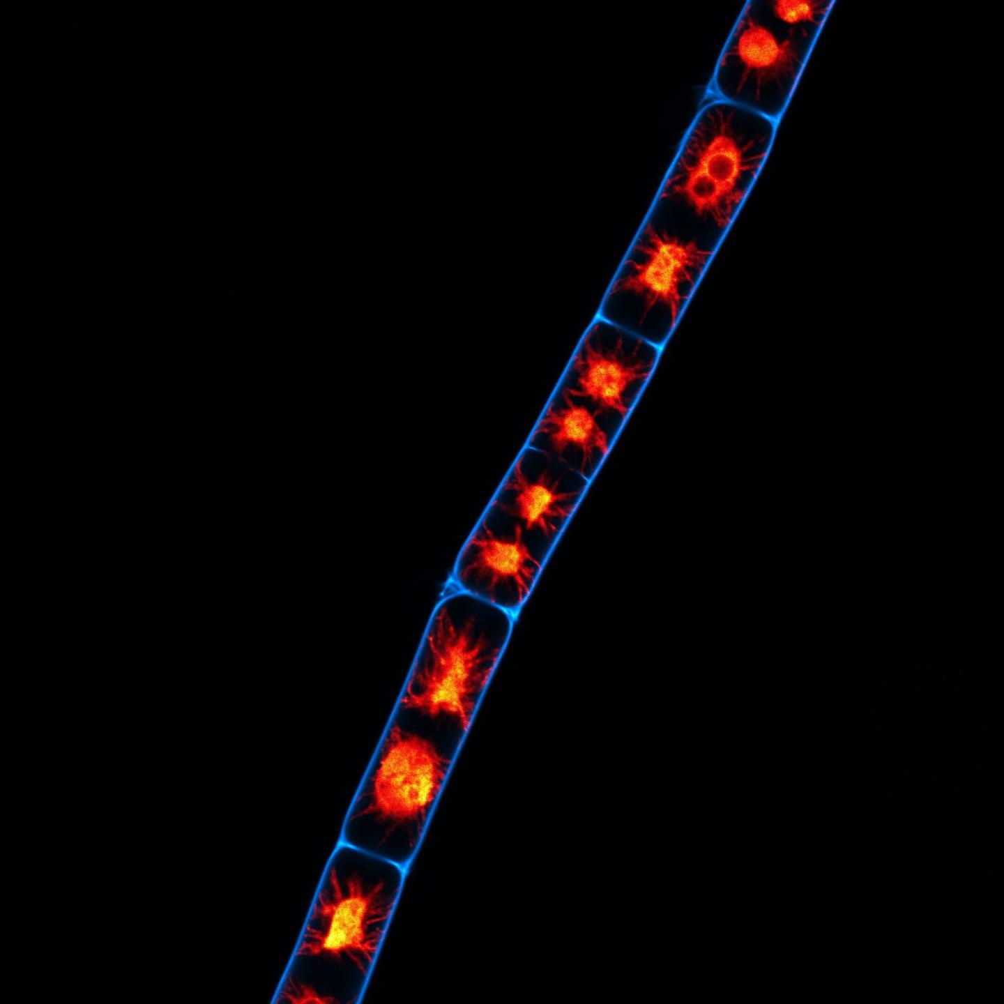 image: In the past, the researchers identified a gene in Zygnema algae that could play a role in stress hormone regulation. Now they have characterized the gene's function. The image was taken by confocal laser-scanning microscopy and shows cell walls (in blue) and chloroplasts (in red) of the Zygnema algae.