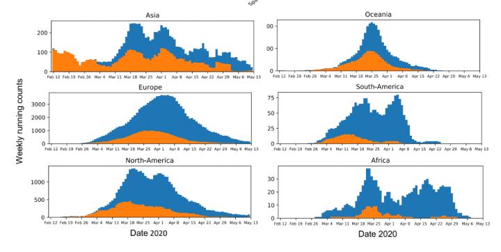 image: This figure shows the running weekly average counts of sampled SARS-CoV-2 sequences exhibiting the D variant (orange) and G variant (blue) in different continents between January 12 and May 12.