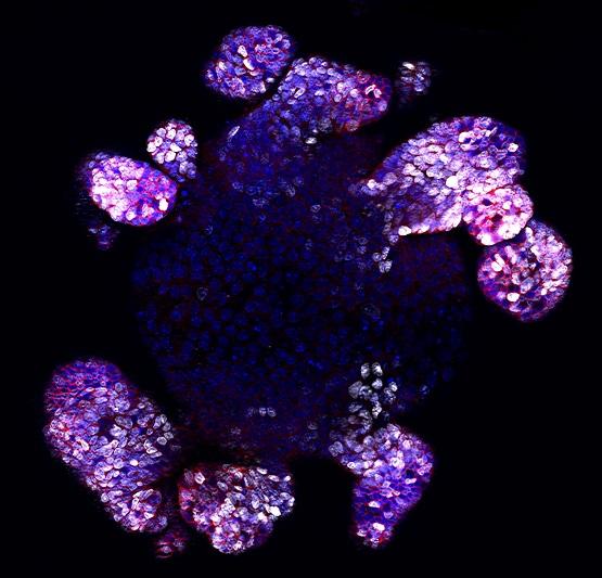 image: Fluorescent picture of an intestinal organoid (stained for the proliferation marker Ki-67 (white), the stem cell marker Ephb2 (red) and DNA (blue).