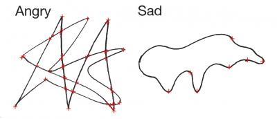 image: Characteristic angry and sad drawings from study 3, after smoothing and corner detection. Corners are marked with red '+' signs. Among the study's participants, angry drawings had a mean of 23.3 corners, while sad drawings had a mean of 6.6 corners.