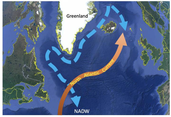 image: The warm North Atlantic Current - the northernmost part of the Gulf Stream - flows into the Greenland Sea. It becomes progressively colder and saltier due to heat loss to the air, eventually sinking and forming the North Atlantic Deep Water (NADW) formation - a mass of deep, cold water that flows southward. Melting of the polar ice sheet in the Arctic region would result in more fresh water entering the ocean and disrupting that circulation pattern, potentially causing cooling in northern areas of Europe and North America.