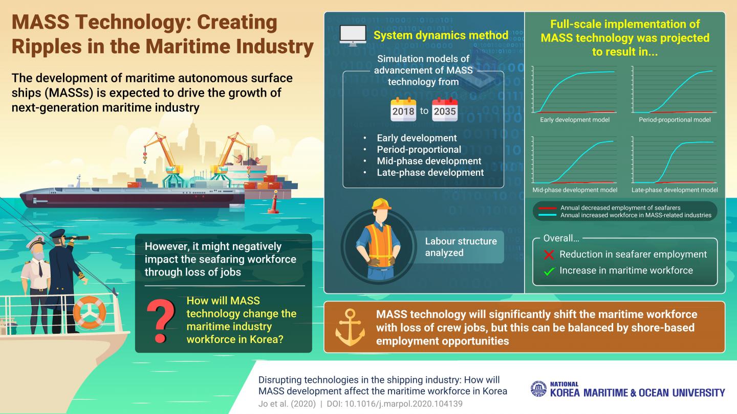 To find out, researchers from Korea used complex mathematical models and simulations to determine the effect of MASS technology on jobs lost and gained over time. In their study published in Marine Policy, Assistant Professor Sohyun Jo from Korea Maritime and Ocean University--the lead scientist on this study and a former navigation officer--simulated four possible scenarios depicting varying speeds of growth of MASS technology. The projected outcomes in all the scenarios were consistent; in all examined scenarios, the number of seafarer jobs decreased, but at least fifty times as many shore-based jobs as the lost seafarer jobs were newly created.
