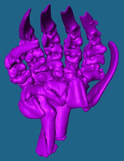 This is a computer-tomographical representation of the paw skeleton of a mole (Talpa occidentalis); the sickle-shaped extra "thumb" is clearly visible.
