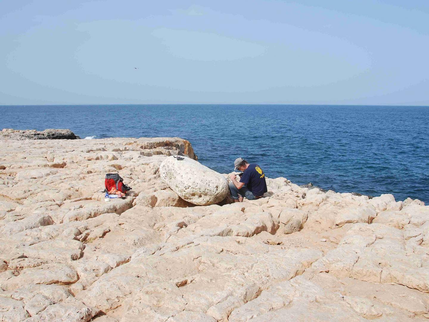 image: Klaus Reicherter from the University of Aachen examines a boulder that the tsunami carried onto the cliffs.