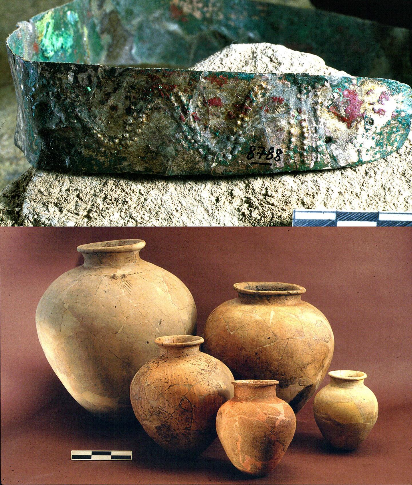 image: Above: Copper-silver diadem with Transcaucasian connection from the Royal Tomb in Arslantepe, Eastern Turkey. Below: Mesopotamian-related pottery in Arslantepe (palace period)