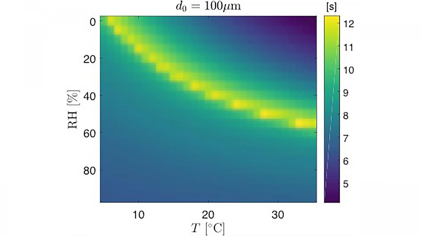 image: Color map showing the amount of time a free-falling 100-micron droplet at an initial height of 1.6 meters is affected by temperature and humidity. For relative humidities (RH) and temperatures (T) below the yellow arc, the droplet will fall to the ground in the number of seconds indicated by the color scale; above the arc, the droplet will completely evaporate in air, never reaching the ground.
