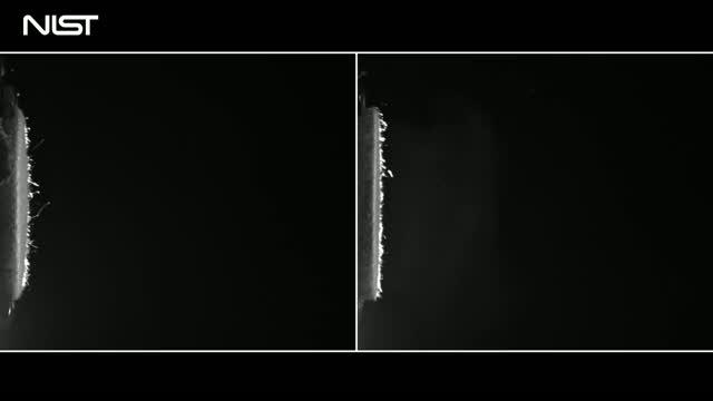 video: A swatch of cotton fabric that has been exposed to high humidity typical of a person's exhaled breath (left) filters out more droplets than a swatch of cotton fabric that has not been exposed to high humidity (right).