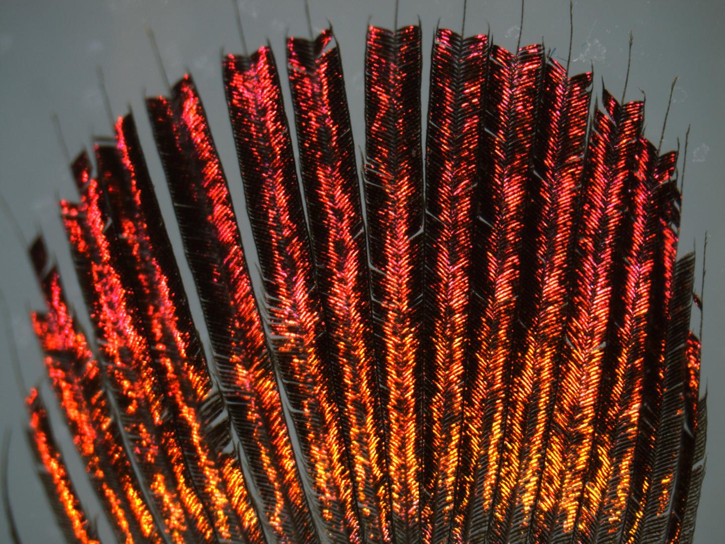 image: This is a close-up of a Ruby-throated Hummingbird feather.