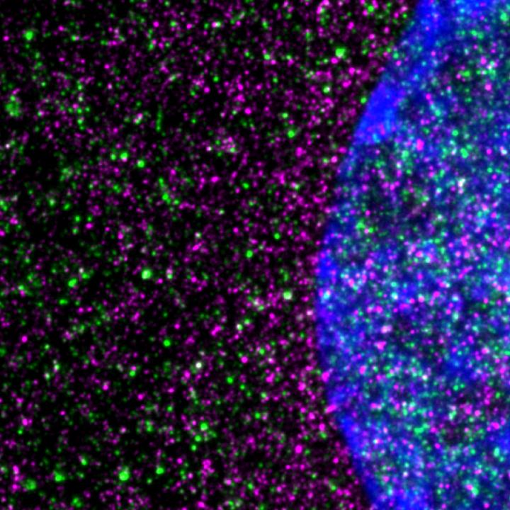 image: Disease-causing huntingtin, shown in red, interacts with ribosomes, shown in green, in a striatal neuron. The nucleus is blue.