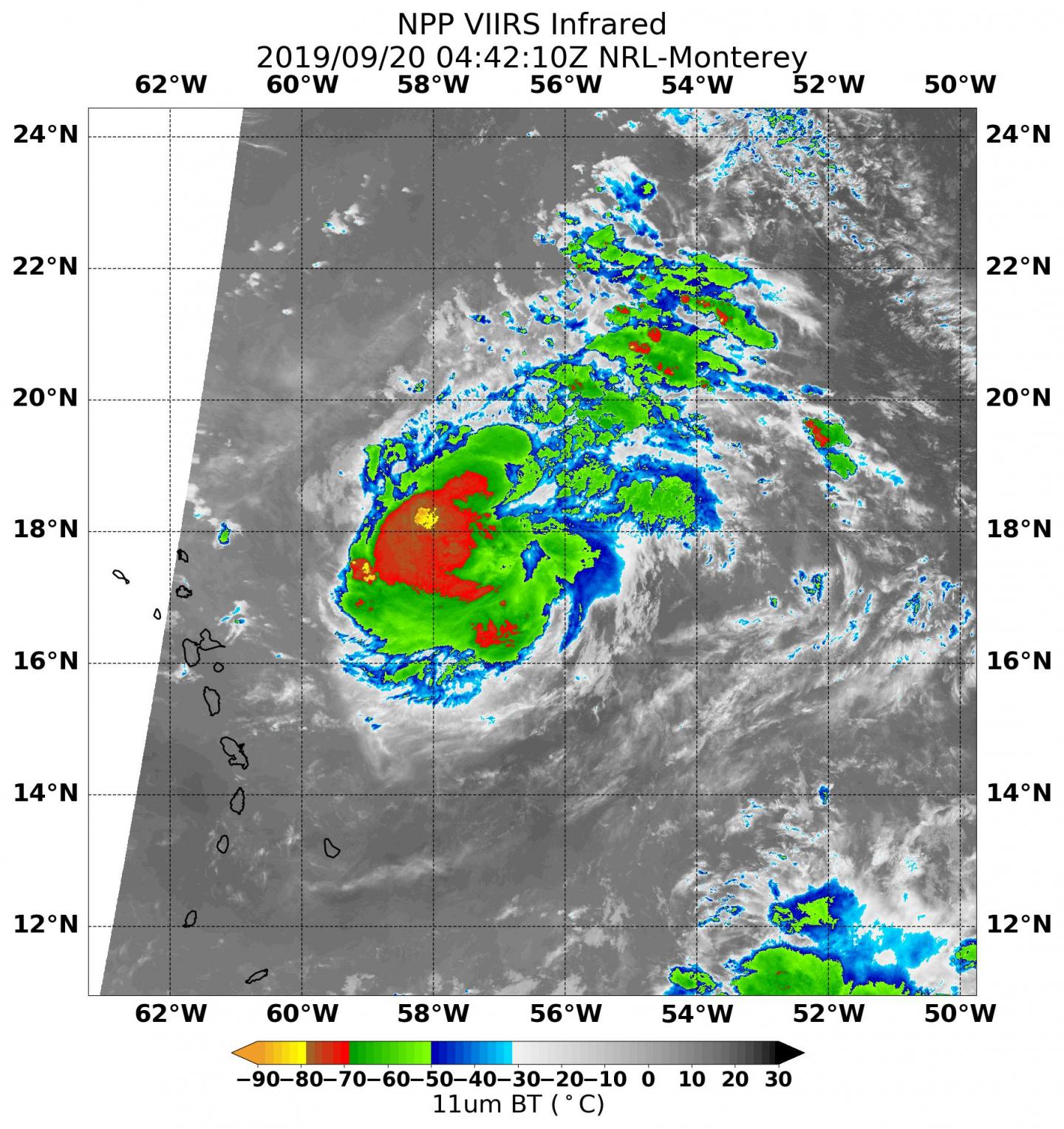 On Sept. 20 at 12:42 a.m. EDT (0442 UTC), the Visible Infrared Imaging Radiometer Suite (VIIRS) instrument aboard Suomi NPP found that the strongest thunderstorms circling Jerry's center had cloud top temperatures as cold as minus 70 degrees Fahrenheit (minus 56.6 Celsius). NASA research has shown that cloud top temperatures that cold indicate strong storms have the potential to generate heavy rainfall.