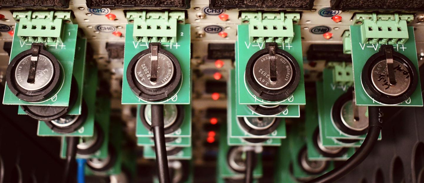 image: Prototype lithium metal batteries with carbon nanomembrane modified separators being tested at Wayne State University .