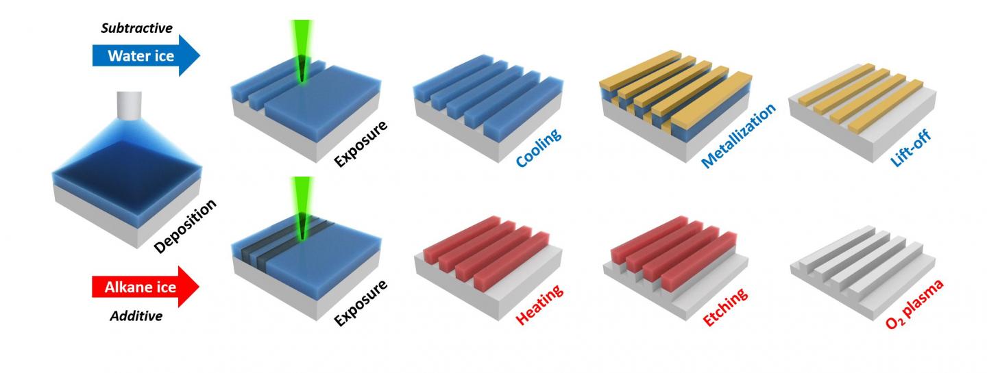 image: IL process flow. Water ice acts as a positive-tone lithography resist, and alkane ice demonstrates a negative-resist-like capability.
