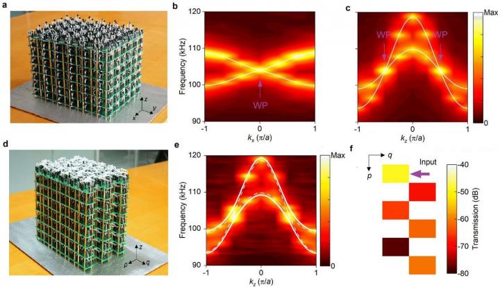 Recently, Dr. Rujiang Li and Prof. Hongsheng Chen from Zhejiang University, Dr. Bo Lv and Prof. Jinhui Shi from Harbin Engineering University, Prof. Huibin Tao from Xi'an Jiaotong University, and Prof. Baile Zhang and Prof. Yidong Chong from Nanyang Technological University observe the ideal type-II Weyl points in classical circuits by utilizing the high flexibility of circuit node connections. For a circuit structure with periodic boundaries in three dimensions (Fig. 1a), this Weyl system only has two bands. Due to the protections from mirror symmetries and the time-reversal symmetry, there exists the minimal number of four type-II Weyl points in momentum space and these Weyl points reside at the same frequency. Experimentally, they prove the existence of linear degenerate points and the strongly tilted band structure by reconstructing the band structures of the circuit system (Fig. 1b-c), which imply that these four Weyl points are ideal type-II Weyl points. Besides, they fabricate a circuit structure with an open boundary (Fig. 1d) and observe the topological surface states within an incomplete bandgap (Fig. 1e-f). These phenomena further imply the existence of ideal type-II Weyl points.
