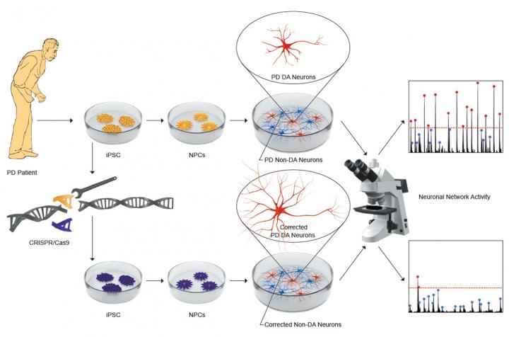 image: Schematic of the experimental design for investigating the emergence of functional alterations in dopaminergic neurons obtained from PD patient-specific iPSC. After their generation in the plate, monitorisation of calcium intracellular levels has been used to follow the organisational changes and dynamical traits of the neuronal networks during maturation. Functional analysis of the neuronal connectivity in these cultures allowed the study of early events that originate the pathology. Gene editing in the original patient derived iPSC allowed to revert these defects.