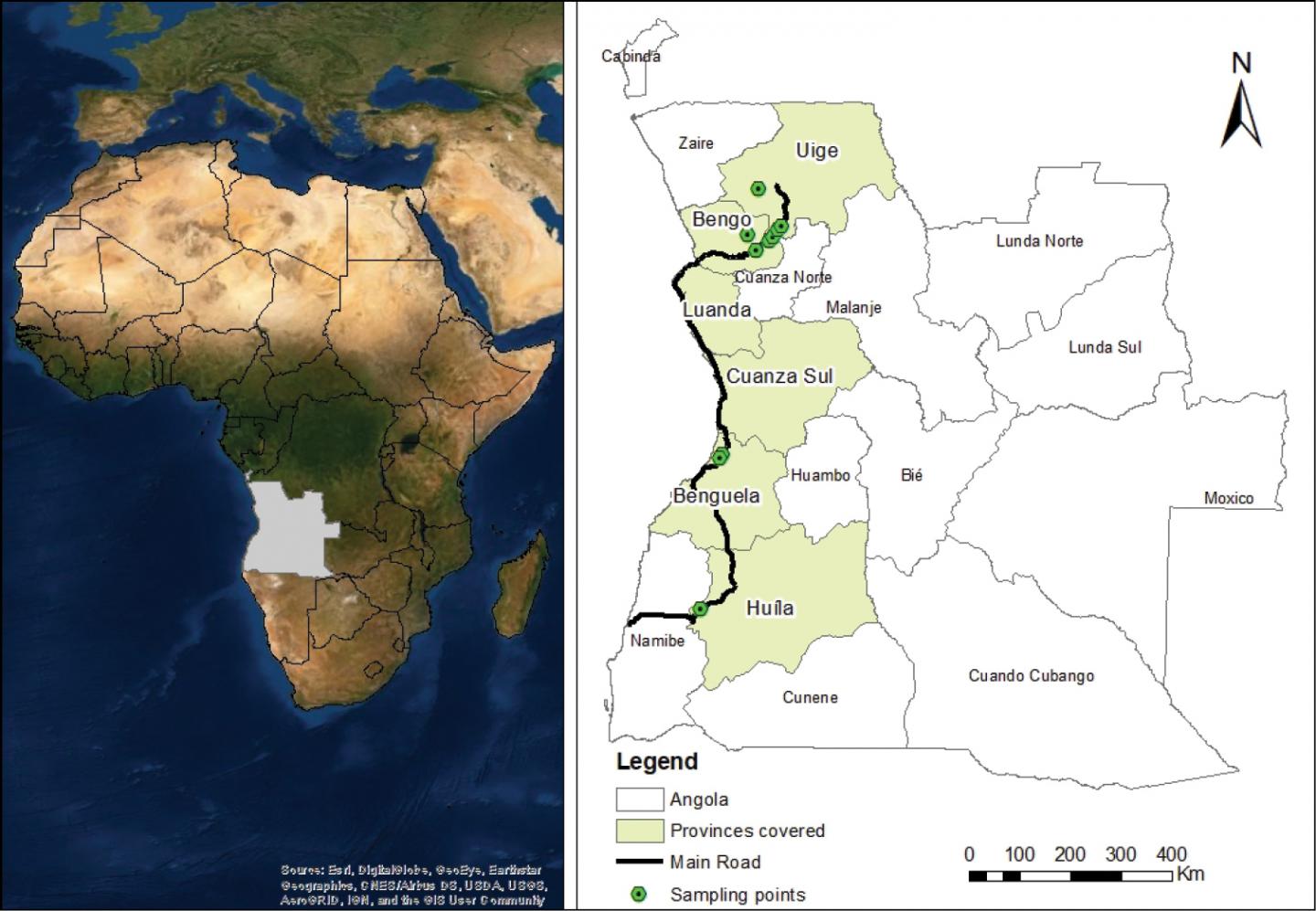 image: Map of Africa showing the location of Angola (left) and the provinces covered by the study along the main road from Lubango (Huíla province) to Uíge (right).