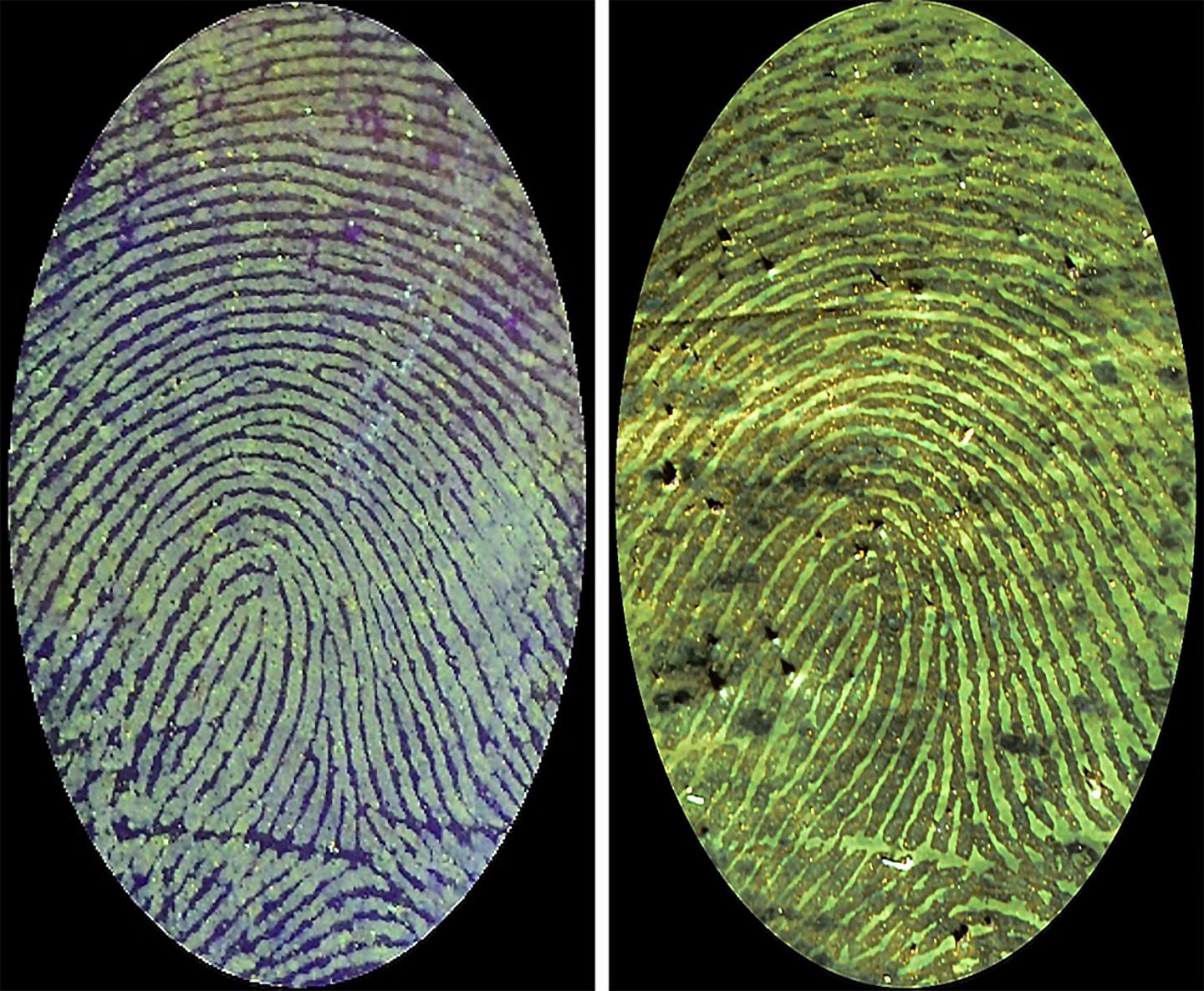 image:Â Fingerprint patterns made in blood are clearly visible on aluminum foil (left) and painted wood (right) when developed with a fluorescent polymer.