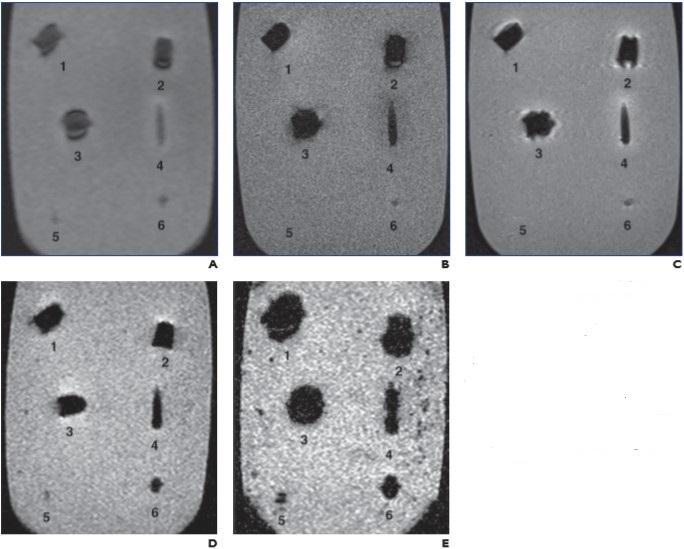 image: Scout (A), T1-weighted spin-echo (SE) (B), T2-weighted SE (C), T2-weighted gradient-recalled echo (GRE) (TR/TE, 500/10; D), and T2-weighted GRE (TR/TE, 700/30; E) MR images show jacket hollow point .45 automatic Colt pistol bullet (Corbon) (1), solid lead .45 Long Colt bullet (Winchester) (2), full metal jacket (FMJ) automatic Colt pistol bullet (Winchester) (3), 5.56-mm FMJ bullet (Federal Ammunition) (4), #7 lead shotgun pellet (Winchester) (5), and 5-mm lead air gun pellet (Sheridan) (6). On all sequences, metallic artifact is minimal. Although metallic artifact increases or blooms with increased TR/TE in GRE images (D and E), amount of surrounding distortion is still minimal.