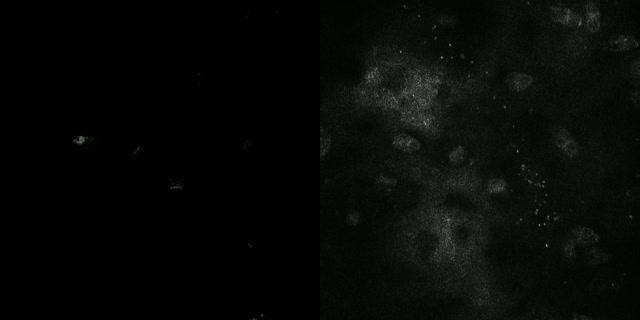 video: Real-time image of CGCs filmed at 15 frames per second. CFM imaging is shown in left and CRM imaging shown in right. CFM allows real-time imaging of the goblet cells with higher image contrast than the existing imaging methods.