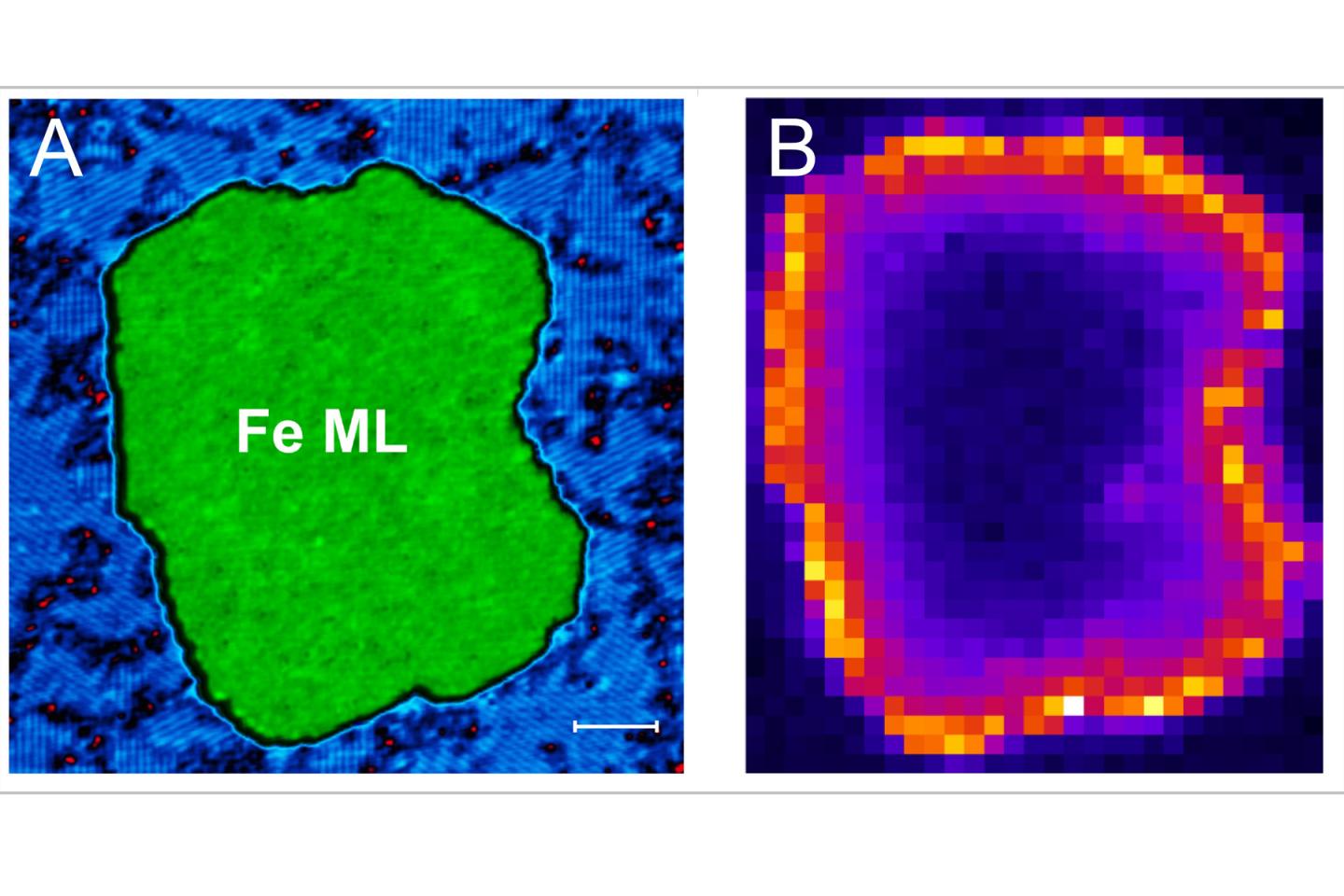 image: A. A monolayer of iron atoms assembled on a rhenium surface. B. Image of a Majorana fermion as a bright line along the edge of the iron using a scanning tunneling microscope.