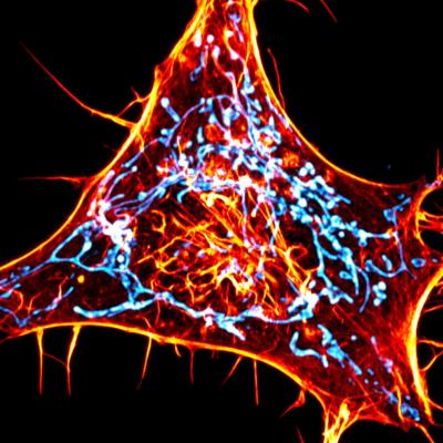 image: A cancer cell labeled for actin (red) and mitochondria (cyan). The scientists designed novel probes that specifically monitor interactions between actin and mitochondria.