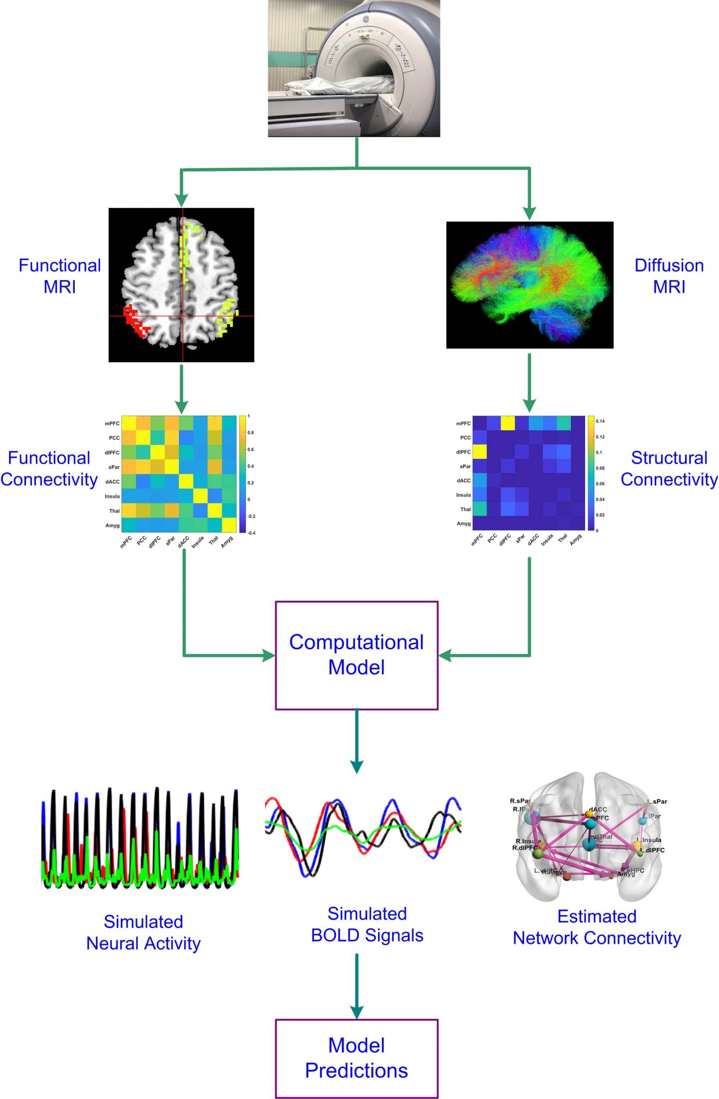image: Overview of the computational modeling study. MRI is performed to obtain functional MRI (fMRI) and diffusion MRI (dMRI) data of the patient. Functional connectivity (FC) and structural connectivity (SC) are computed based on fMRI blood-oxygen-level-dependent (BOLD) signals and dfMRI tractography. The SC and FC information is used as input to the computational model which generates simulated neural activity and corresponding simulated BOLD signals, together with estimates of the intra-regional and inter-regional connectivity parameters. Predictions about the pathophysiological mechanisms of major depressive disorder (MDD) can then be made by comparing the connectivity parameter estimates of normal control (NC) patients with individuals with MDD.