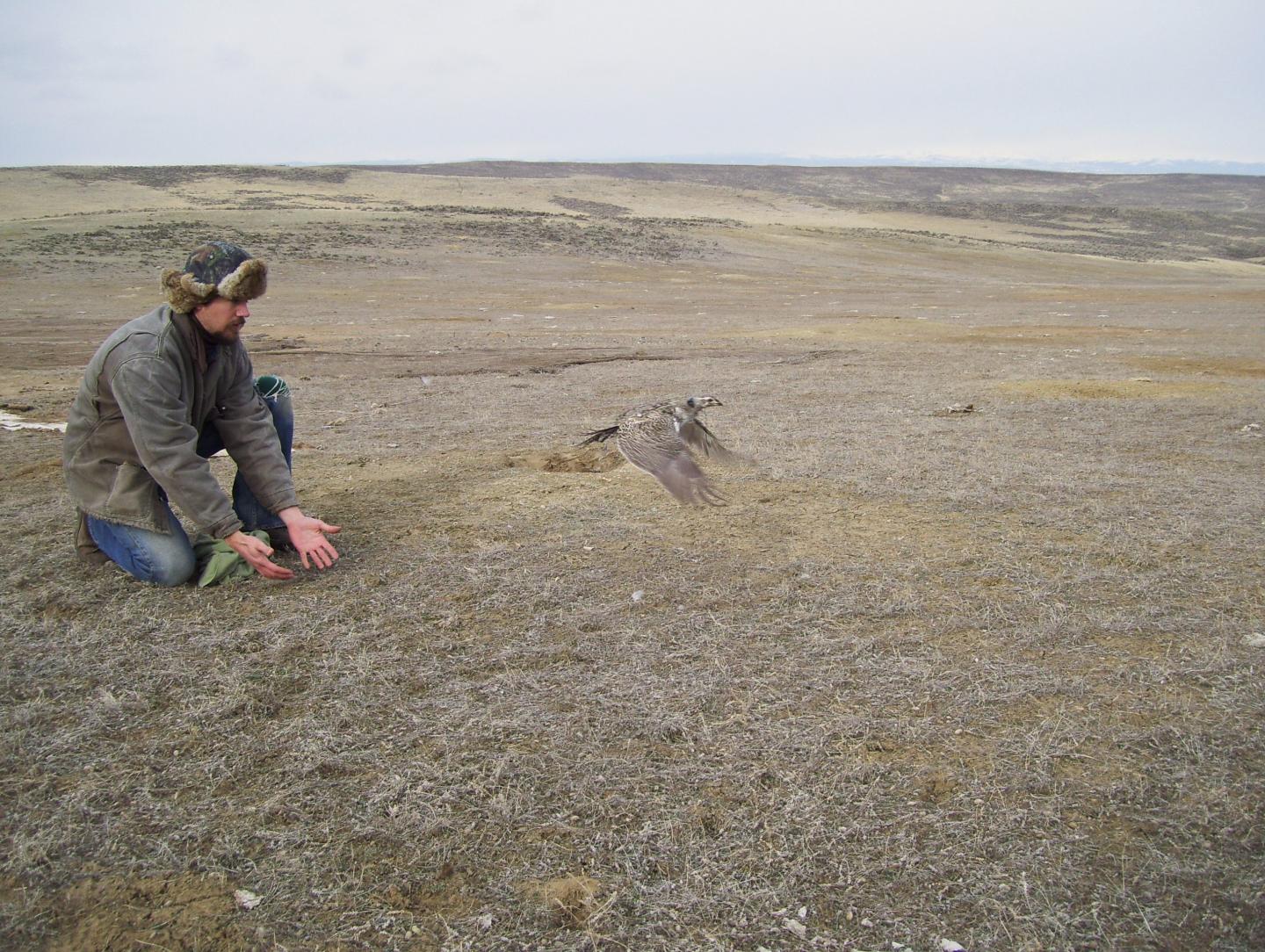 image: Andrew Sulphin -co author- releasing tagged female greater sage-grouse