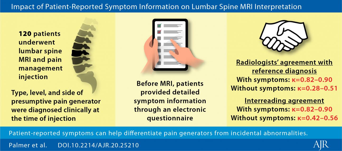 Leesburg, VA, January 25, 2021--According to an open-access article in ARRS' American Journal of Roentgenology (AJR), in lumbar spine MRI, presumptive pain generators diagnosed using symptom information from brief electronic questionnaires showed almost perfect agreement with pain generators diagnosed using symptom information from direct patient interviews.
