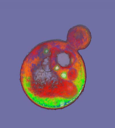 This is an X-ray micrograph of a yeast cell, Saccharomyces cerevisiae, as it buds before dividing.