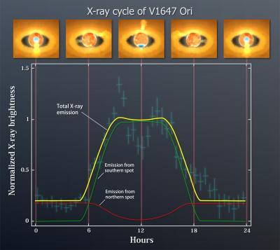 Writing in the July 20 issue of The Astrophysical Journal, the team reports that strong similarities among 11 separate X-ray light curves allowed them to identify cyclic X-ray variations. Remarkably, these periodic signals establish that the star is spinning once each day. V1647 Ori is among the youngest stars whose spin rates have been determined using an X-ray-based technique.