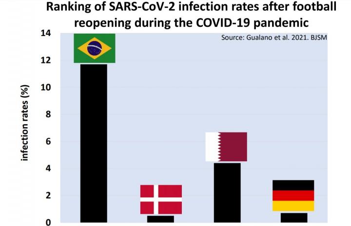 “It’s a much higher attack rate than has been seen in other countries. In Denmark, for example, only four out of 748 players tested positive [0.5%]. The Bundesliga [in Germany] found eight cases out of 1,702 players [0.6%]. Even in Qatar, where there’s a moderate risk of community transmission, the rate was far lower than ours: 24 out of 549 tested positive [4%]. Compared with the other reported rates, our players were infected between three and 24 times more,” Bruno Gualano, a professor at the University of São Paulo’s Medical School (FM-USP) and principal investigator for the study, told Agência FAPESP.