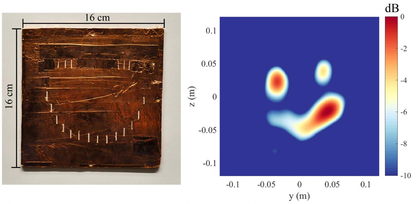 image: A smiley-face-shaped antenna (left) is correctly identified by a new method for passively locating radio wave sources (right).