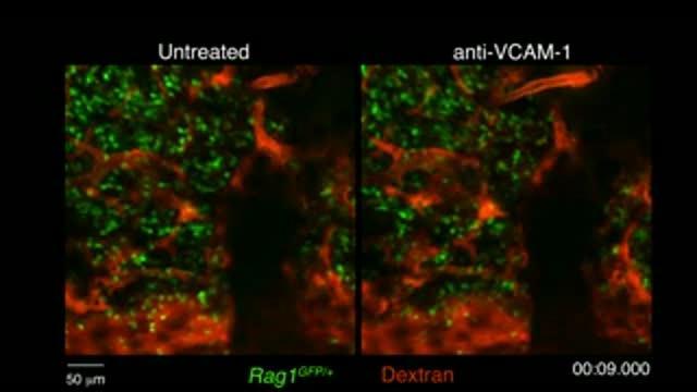 The movement of bone marrow B cells was limited in the absence of VCAM-1, as shown in this time-lapse video. B cells (green) were tracked before (left) and after (right) treatment with anti-VCAM-1 antibodies.