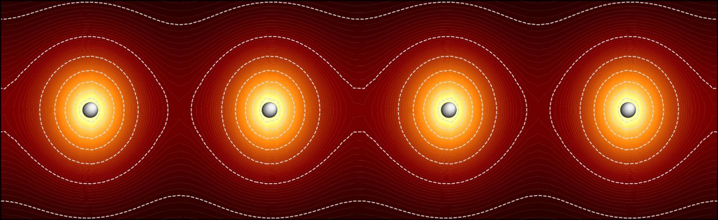 image: A map of where electrons are most likely to be found around a chain of hydrogen atoms. Brighter colors denote higher probabilities. At this spacing between atoms, the electrons try to link pairs of adjacent atoms to form dihydrogen molecules. Because the protons are fixed in place, these molecules can't form. Instead, each electron 'leans' toward a neighboring atom.
