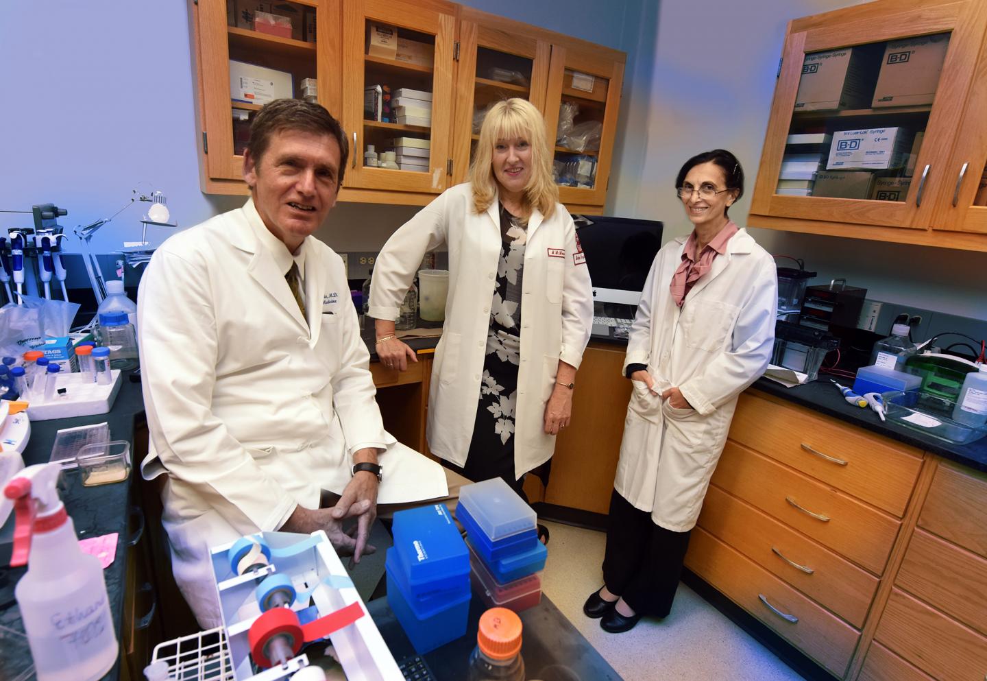 Pictured are: Dr. Michael Madaio (from left), chief lab tech and coauthor Maggie McMenamin and Dr. Nino Kvirkvelia, the study's first author.