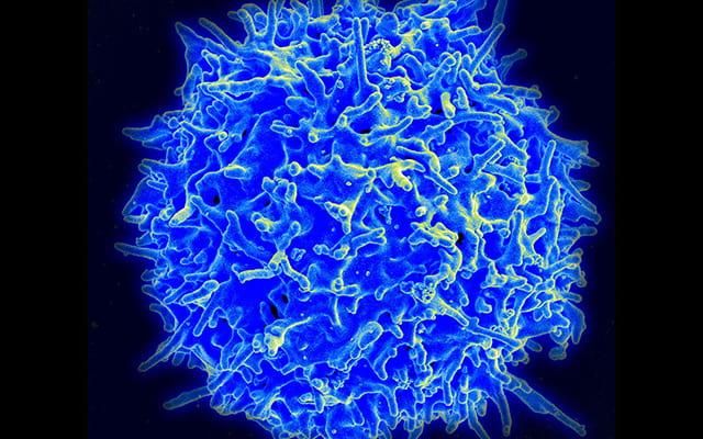 image: Colorized scanning electron micrograph of a T cell, a type of lymphocyte that plays a central role in the immune response.