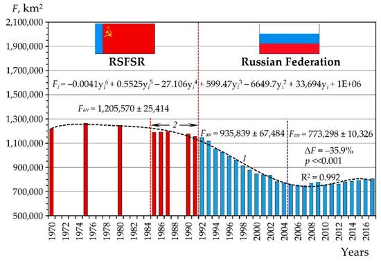 image: Change in the total area of cultivated land (F) in the Russian Federation in 1970-2017. RSFSR--the Russian Soviet Federative Socialist Republic as the principal part of the former USSR until December 1991; Fav--the average area of cultivated land; ?F--relative change in Fav between 1970-1991 and 2005-2017 with p (Student's t-test); R2--the coefficient of determination of a sixth-degree polynomial trend (1); 2--the years of the political and economic reform in the USSR, "Perestroika". In the sixth-degree polynomial equation: Fi is the modeled F-value for the year yi. Note. According to the five-year program for the development of the socialist planned economy of the former USSR, the total area of cultivated land during every five years (...1971-1975, 1976-1980, 1981-1985, and 1986-1990) remained slightly changed.