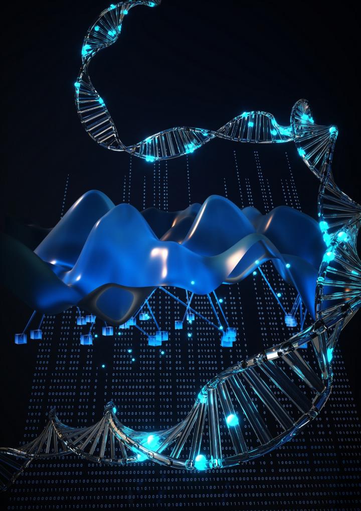 image: An illustration of the research concept that DNA methylation code can be analyzed using information theory, represented by strings of 0s and 1s. This analysis helps researchers understand the epigenetic landscape of cancer (pictured in blue) and identify genes that regulate this landscape, (noted as strings and posts underneath the blue landscape).