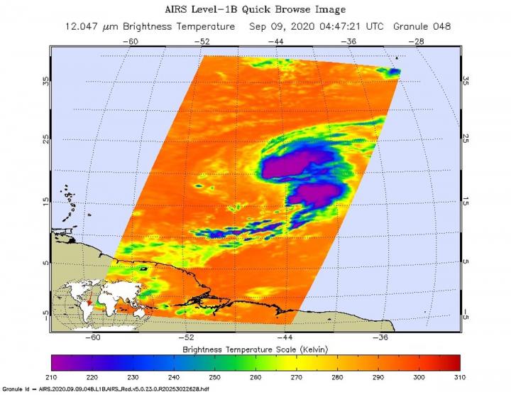 image: On Sept. 9, 2020 at 12:47a.m. EDT (0447 UTC) NASA's Aqua satellite analyzed Tropical Storm Paulette using the Atmospheric Infrared Sounder or AIRS instrument. AIRS found coldest cloud top temperatures as cold as or colder than (purple) minus 63 degrees Fahrenheit (minus 53 degrees Celsius) northeast of the center and in a band of thunderstorms south of center.