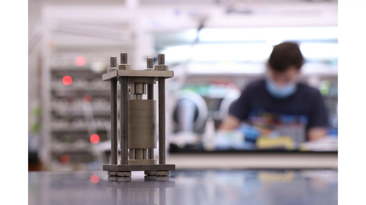 image: Solid-state batteries are charged and discharged in custom-made hardware designed at Georgia Tech. A smaller, modified version of the cell shown here was used to image these materials during cycling.