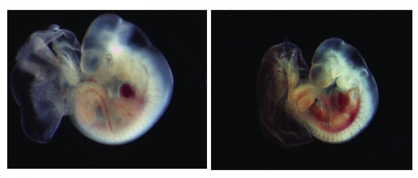 image: Pictures shows a wild type embryo on the left and an embryo expressing inactive Caspase-8 causing cardiovascular destruction (right)