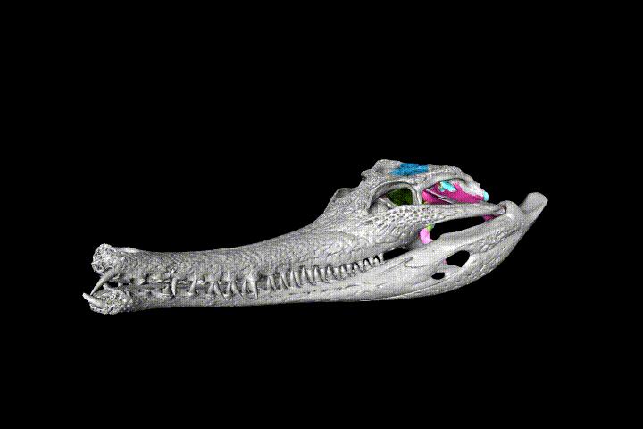 image: A 3D skull model of the false gharial Tomistoma schlegelii; the bones of the braincase are in colour. The specimen is from the collection of the Zoological Museum, Moscow State University, Moscow