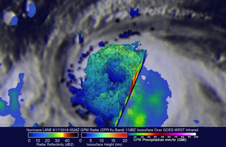 GPM passed above Lane in the Eastern Pacific Ocean on Aug. 17, 2018, at 1:26 a.m. EDT (0526 UTC). Lane was intensifying and data collected by GPM's Microwave Imager (GMI) and Dual-Frequency Precipitation Radar (DPR) instruments revealed the location of its forming eye wall. Very heavy precipitation was shown by DPR in the forming eye wall. Intense rainfall was also found falling at a rate of over 128 mm (5 inches) per hour in convective storms wrapping around the southern side of the intensifying tropical cyclone. GPM is a joint mission between NASA and the Japan Aerospace Exploration Agency, JAXA.