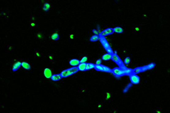 image: N2-fixing bacteria Pseudomonas stutzeri labeled with fluorescent marker (green) introduced into filaments of Rhodotorula mucilaginosa fungus.