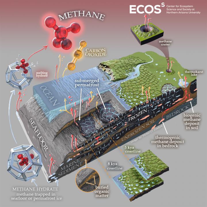 image: This artistic diagram of the subsea and coastal permafrost ecosystems emphasizes greenhouse gas production and release. Sandia National Laboratories geosciences engineer Jennifer Frederick is one of the authors in a recent study regarding the release of such gases from submarine permafrost.