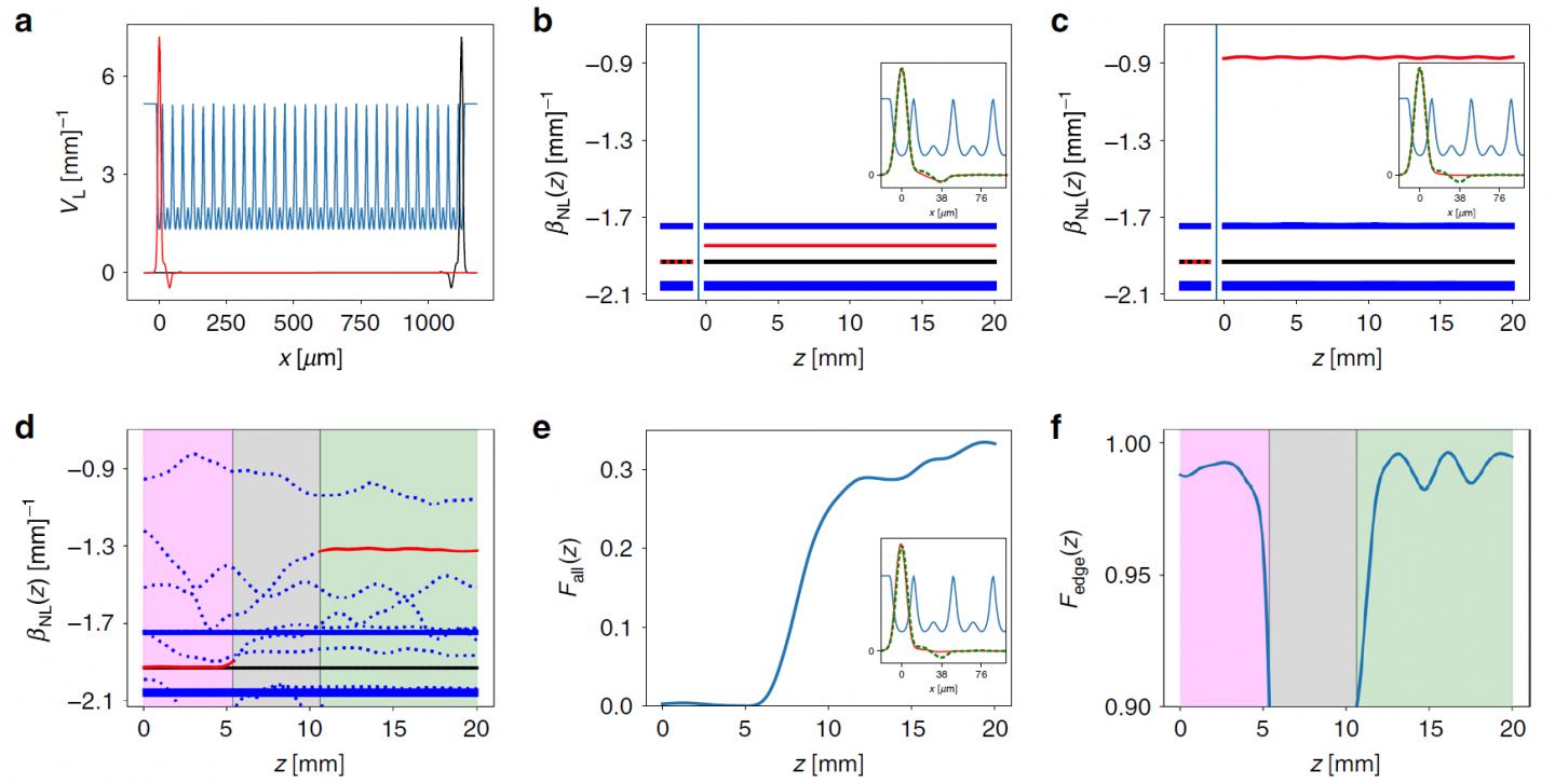 the nonlinear edge mode φ_(NL,edge), which inherits the pro?le of the linear edge mode φ_(L,edge) in the edge channel and is quanti?ed by F_edge (z)?0.98 after the nonlinear coupling has occurred, although it lacks the amplitude in the third waveguide. Thus, for a high nonlinearity, the eigenvalue of φ_(NL,edge) moves outside the gap (see Fig. 2c), and the edge mode is dominated by nonlinearity but has some features inherited from the linear topological edge mode; for a low nonlinearity, its eigenvalue stays inside the gap, so it is dominated mainly by the topology."