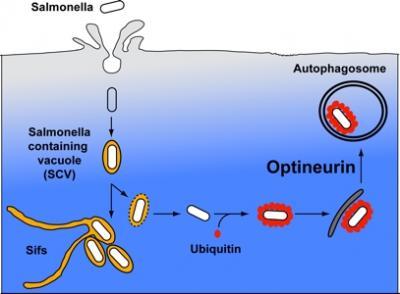 As reported in a current article in the scientific journal "Science", the salmonella are marked as 'waste material' by the molecule ubiquitin. In order for the autophagosomes to become active, the marked bacteria have to bind to another molecule – LC3 – on the autophagosomal membrane. Here, the protein optineurin plays a key role, linking the marked Salmonella to the autophagosmal LC3, thereby setting off a process of selective autophagy. But optineurin becomes active as a link only after being chemically modified by an enzyme, (in this case it is phosphorylated by the protein kinase TBK1). "We suspect that phosphorylation acts as a regulated switch to trigger selective autophagy of bacteria but might also prove significant in other cargoes like protein aggregates or damaged mitochondria" explains Prof. Ivan Dikic, underlining the importance of these findings. It is thought that impaired autophagy processes may be implicated in, among other things, the development of cancer as well as neurodegenerative diseases.