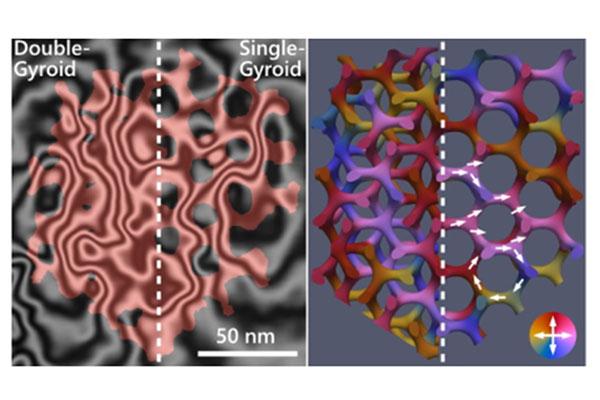 The researchers produced Ni75Fe25 single-gyroid and double-gyroid (formed from a mirror-image pair of single-gyroids) nanostructures with 11 nm diameter struts and a 42 nm unit cell, via block co-polymer templating and electrodeposition. These dimensions are comparable to domain wall widths and spin wave wavelengths in Ni-Fe. They then imaged the gyroid nanoparticles with off-axis electron holography, which could map the magnetization and stray magnetic field patterns in and around the gyroids' struts with nanometer spatial resolution. Analysis of the patterns with the aid of finite-element micromagnetic simulations revealed a very intricate magnetic state which is overall ferromagnetic but without a unique equilibrium configuration (Figure 3), implying that a magnetic gyroid can adopt a large number of stable states.