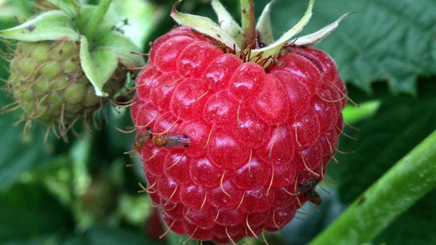 image: An invasive spotted wing drosophila (Drosophila suzukii) on a raspberry.