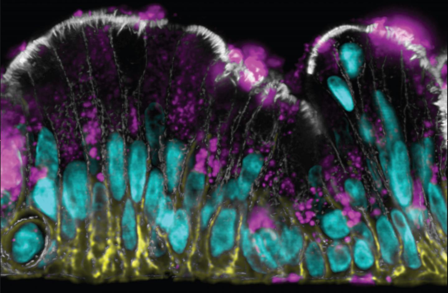 image: This immunofluorescence microscopic image of a cross section of the Colon Chip shows differentiated Goblet cells with mucus-containing granules (magenta), nuclei that are positioned close to the basal side attached to the porous membrane (cyan), lateral cell adhesion complexes (yellow), and an apical lumen-exposed brush border (gray).