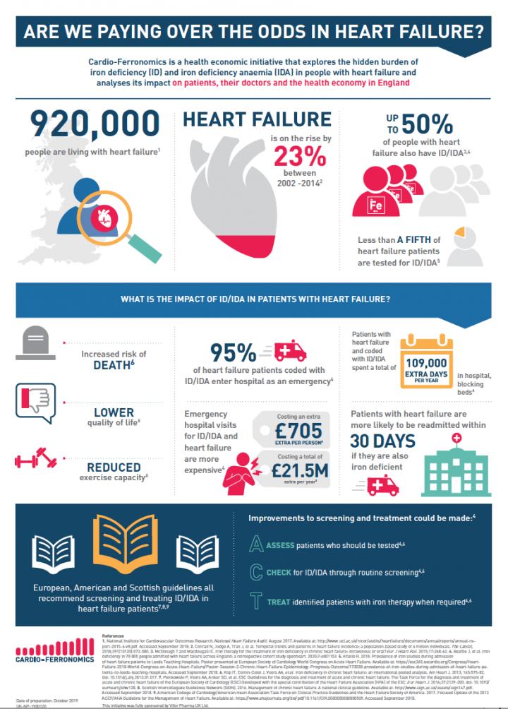 Across the NHS, there is a clear disparity in the care that patients with HF receive.2 In patients who were screened and treated for ID, data show that the amount of time they spent in hospital varied widely, with a difference of up to 18 bed days.2 Patients across the lowest and highest tier Clinical Commissioning Groups (CCGs) across England spent eight and 26 days in hospital respectively, with each day costing the NHS around £400 per patient.2 This disparity suggests that international guidance is not being consistently followed. European, Scottish and American guidance highlight the importance of managing ID/IDA in HF in order to improve patients' quality of life and exercise capacity and reducing hospitalisations, recommending that clinicians consider available intravenous iron therapy in appropriate patients.9-11